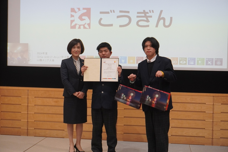 2024年、SDGsの目標達成に向けた高校生たちのアイデアコンテスト「SDGs QUESTみらい甲子園」が山陰で初開催され、当行は「ごうぎん賞」を設け審査に協力しました。2025年2月に当行本店でファイナルセレモニーが開催され、最終選考に残った12チームが社会課題解決に向けたアイデアを発表しました。