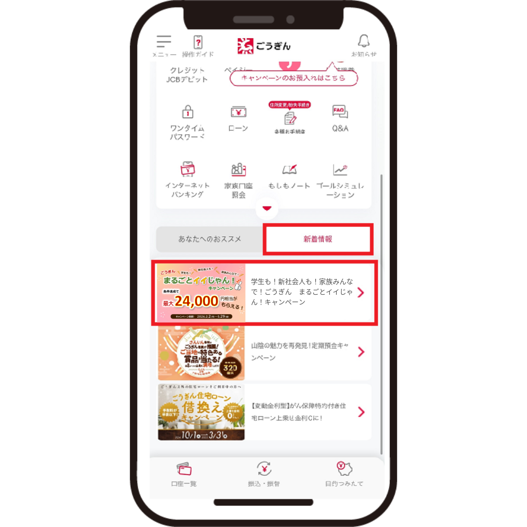 - トップページの新着情報に表示される画像から「ごうぎんまるごとイイじゃん!キャンペーン」の画像をタップする。