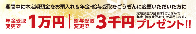 【年金】 現金 10,000円 【給与】 現金 3,000円- 特典は、年金・給与の受取口座へ入金いたします。