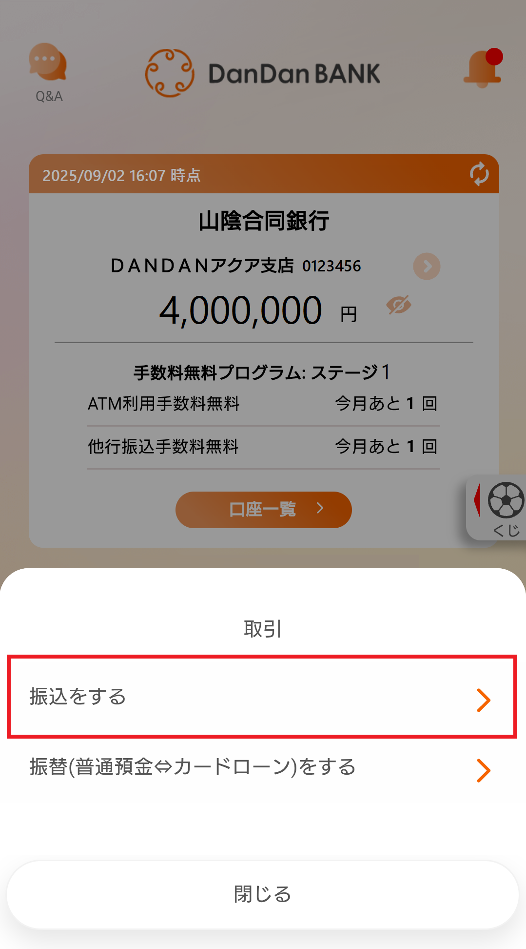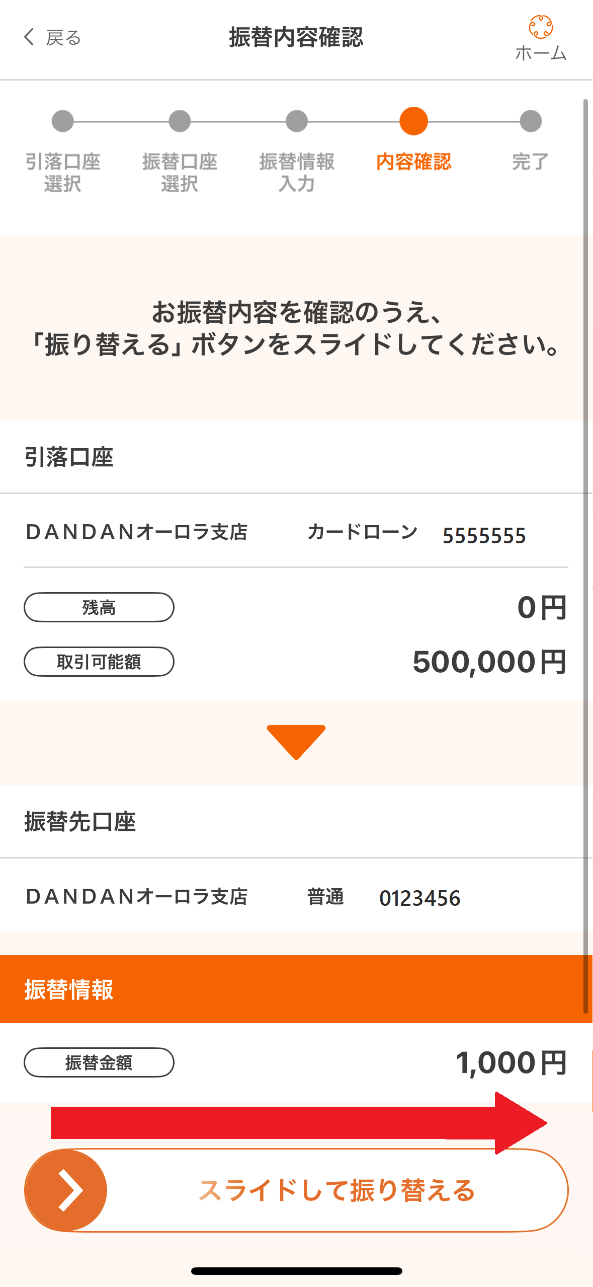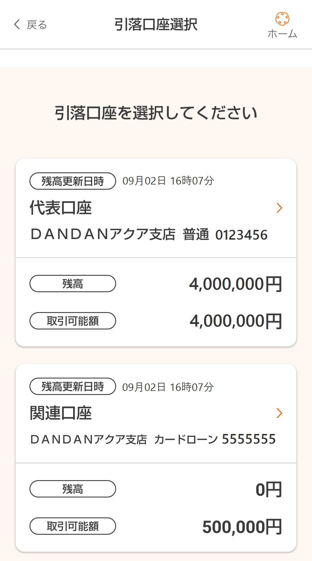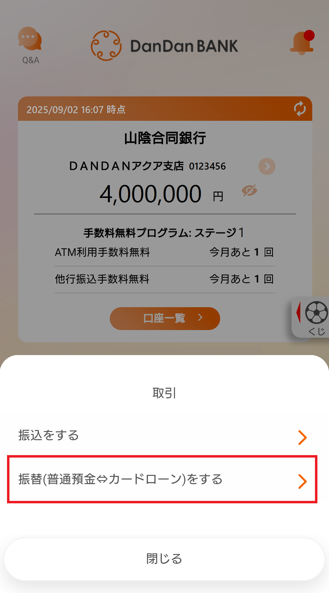 ご自身のDanDan普通預金口座とカードローン口座間で、振替(お借入れ・ご返済)をすることができます。