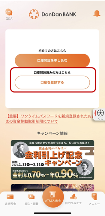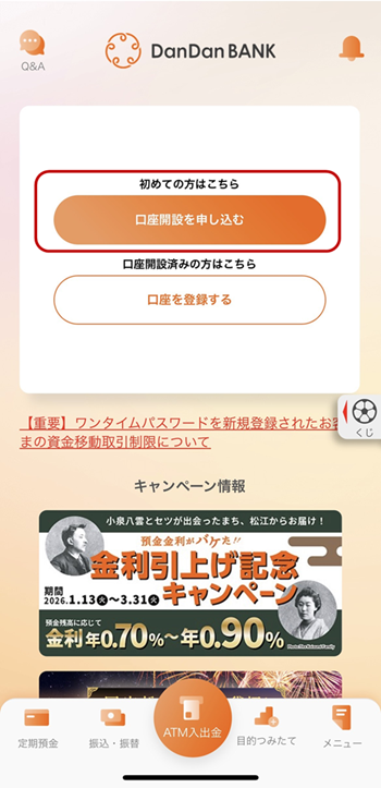 DanDanBANKアプリをダウンロードし、普通預金口座を開設する。