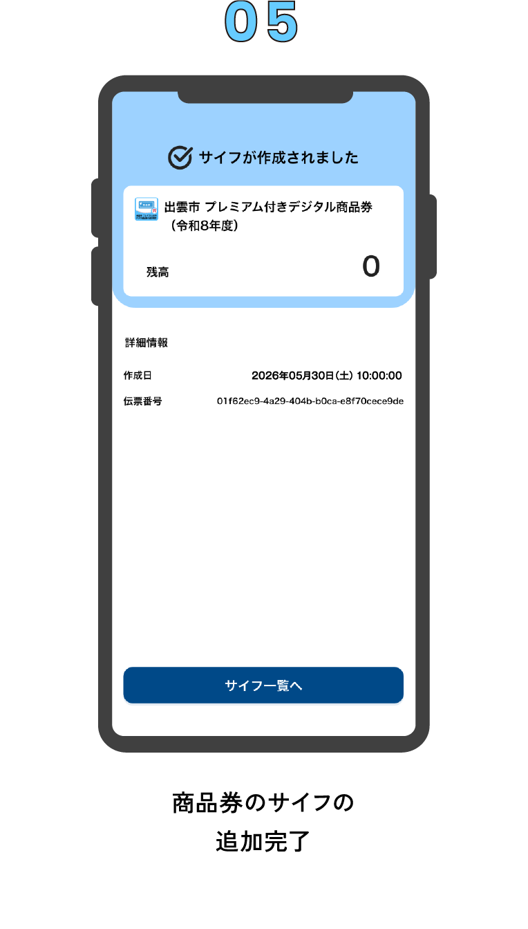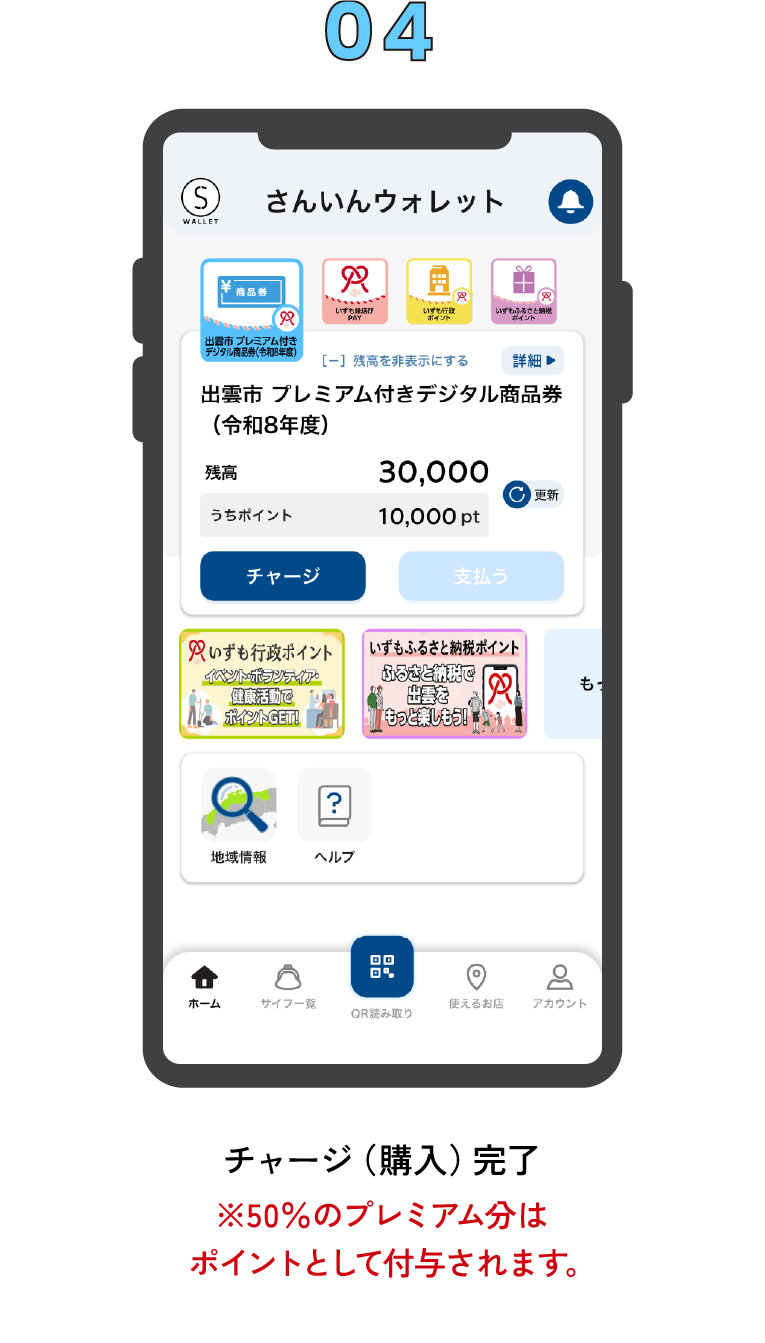商品券のサイフにチャージを行うことで、商品券の購入が完了します。