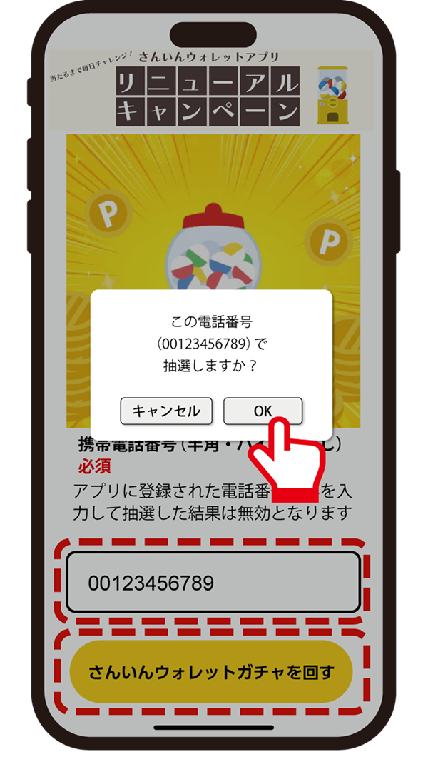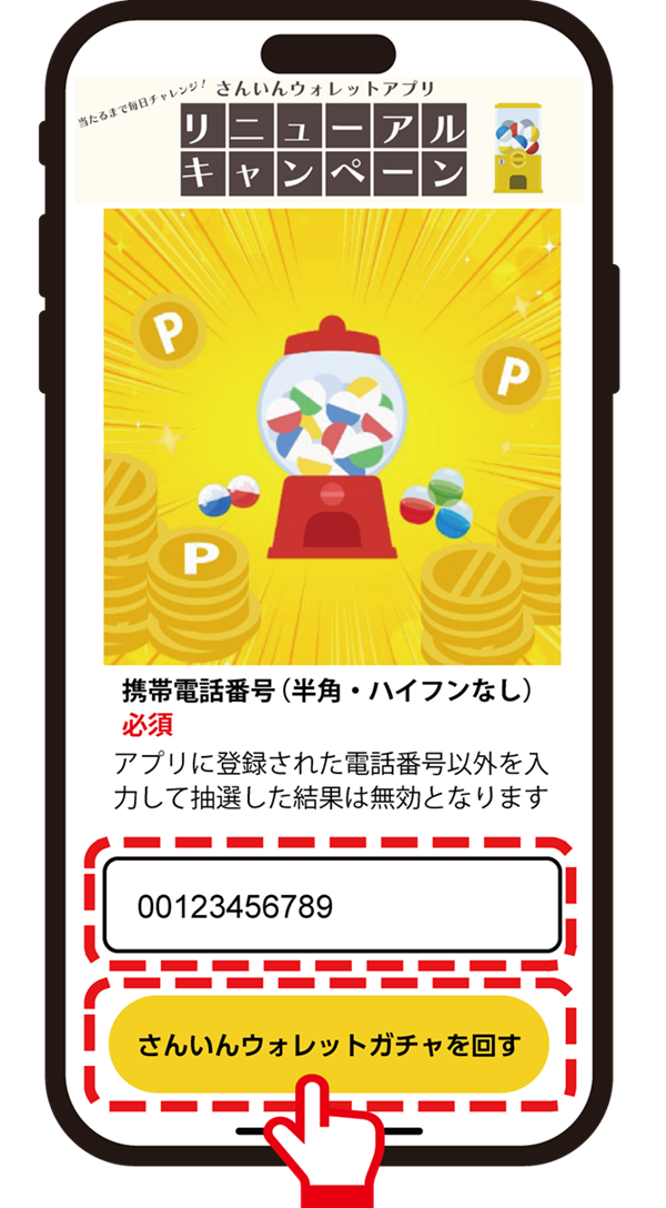 アプリに登録している電話番号を入力し、「ガチャを回す」ボタンをタップします。 - STEP3