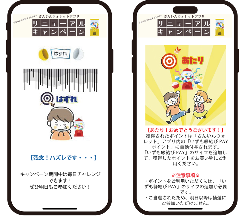 はずれた場合は、当たりが出るまで、イベント期間中1日1回抽選ができます。当たった場合は、自動的に「いずも縁結びPAYポイント」が付与されます。